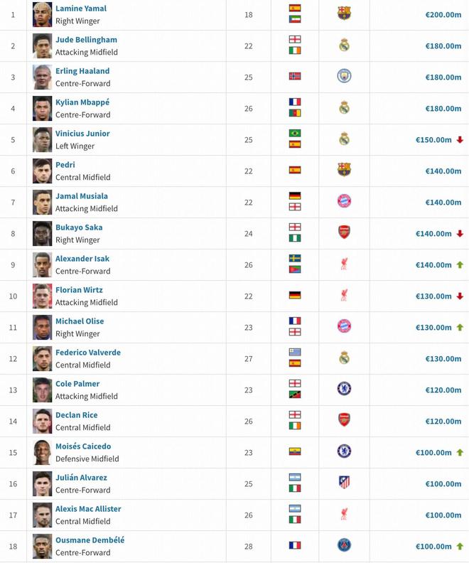 随着英超和德甲球员身价的更新,在德国转会市场身价榜上,目前有18位身价过亿的球员,五大联赛中仅意甲没有球员上榜,莫伊塞斯-凯塞多身价来到了1亿欧,福登身价跌至8000万欧,罗德里身价从1.1亿欧降至9000万欧,奥利塞身价从1亿欧涨至1.3亿欧。